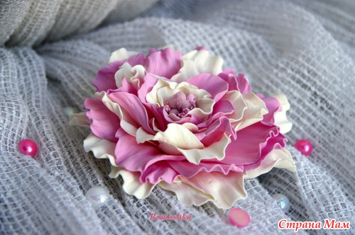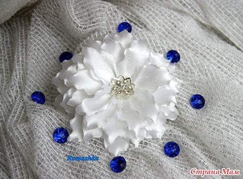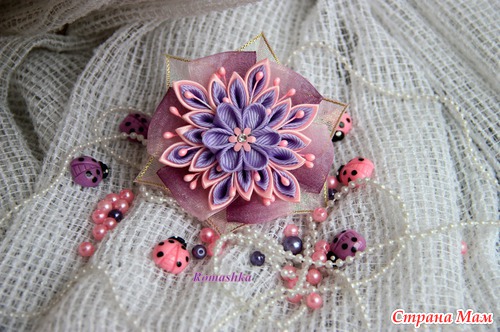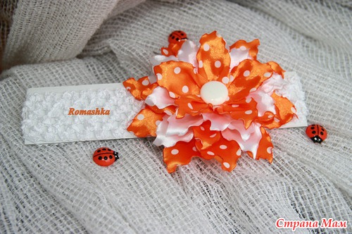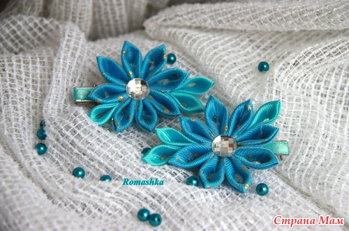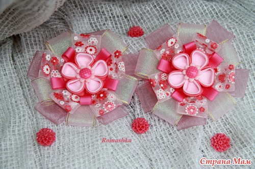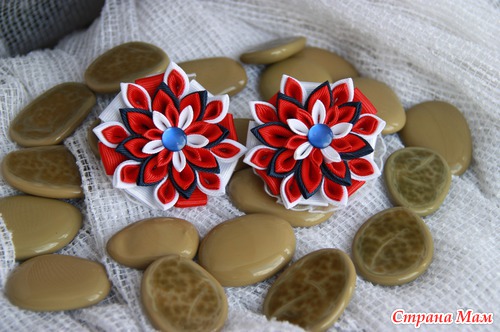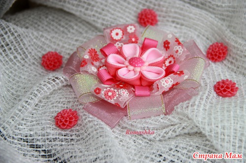 "Нарядный бантик", сделала меньшего размера из ленты 4см шириной, диаметр цветка получился 9см, а не 15, как из широкой ленты