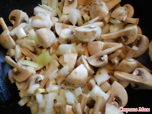 1. шампиньоны нарезала на четыре части и обжарила с луком на сковороде так, чтобы сок не выделился, просто не закрывала крышку и огонь сделала посильнее