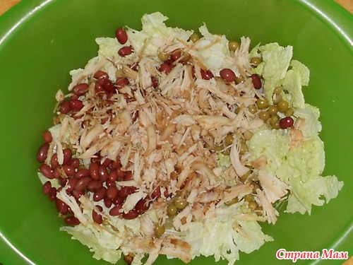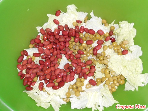 2. листья пекинской капусты разорвала и положила в большую салатницу, чтобы было удобно размешивать. Добавила 100 граммов фасоли в собственном соку (правда промыла под струей холодной воды хорошенечко, чтобы фасоль была одна к одной), затем немножечко консервированного гороха