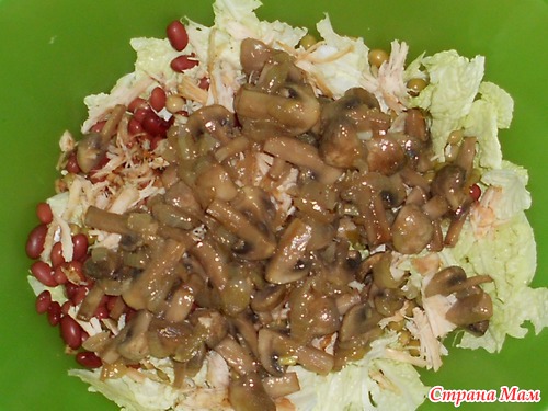 4. добавляю в салатницу шампиньоны, охладив их прежде