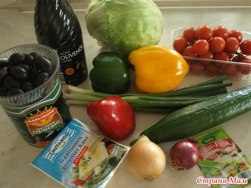 Добавить маслины (оливки ), посыпать равномерно салатной приправой.