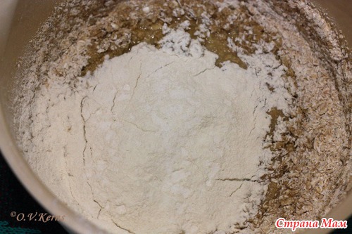 Добавить овсяные хлопья, муку и соду. Быстро перемешать.