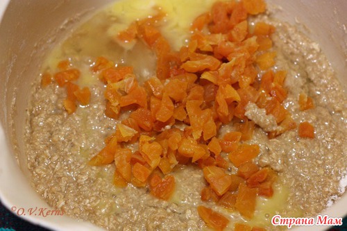Вбить яйцо, добавить курагу и вымесить тесто. Если получается густоватым, то добавьте 2ст. л. воды и тщательно вымесите тесто еще раз.