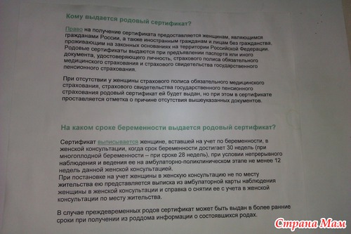 Полезная информация... У нас в подмосковье, видимо, не как у людей, мне его только на след неделе получать сказали, вернее оформлять, а отдадут вообще через две недели, а это уже 32 будет! Интересно, почему? Она 20 недель наблюдения отсчитывала...
