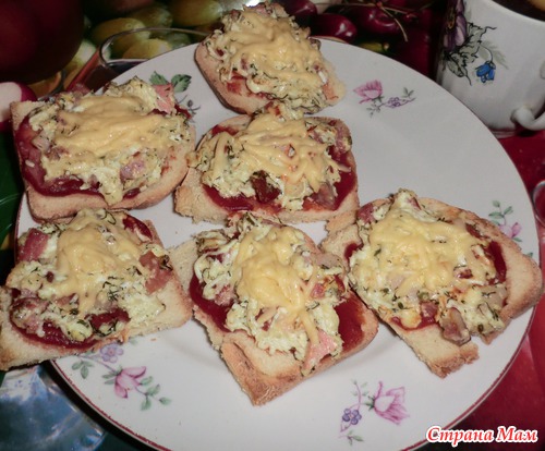 Я готовлю так: вареное яичко тру на терке, добавляю майонез, зелень, чеснок, помидорчик, натираю сыр, соль, перец, и главное колбаса нарезанная кубиками все перемешиваем и наносим на хлеб, хлеб изначально смазываем кетчупом, можно дополнительно присыпать сыром и в духовку минут на 10. Приятного аппетита!!!