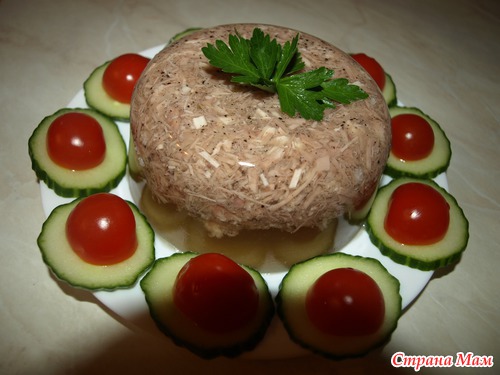 В кастрюлю с бульёном выкладываю порезаное мясо, желатин (у меня плaстинками ), чеснок и довожу до кипения.