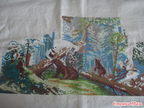 В моей хомячьей норке завалялась недовышитая картина "Утро в сосновом лесу". Начала я этот долгострой еще аж 18 июля 2008 года