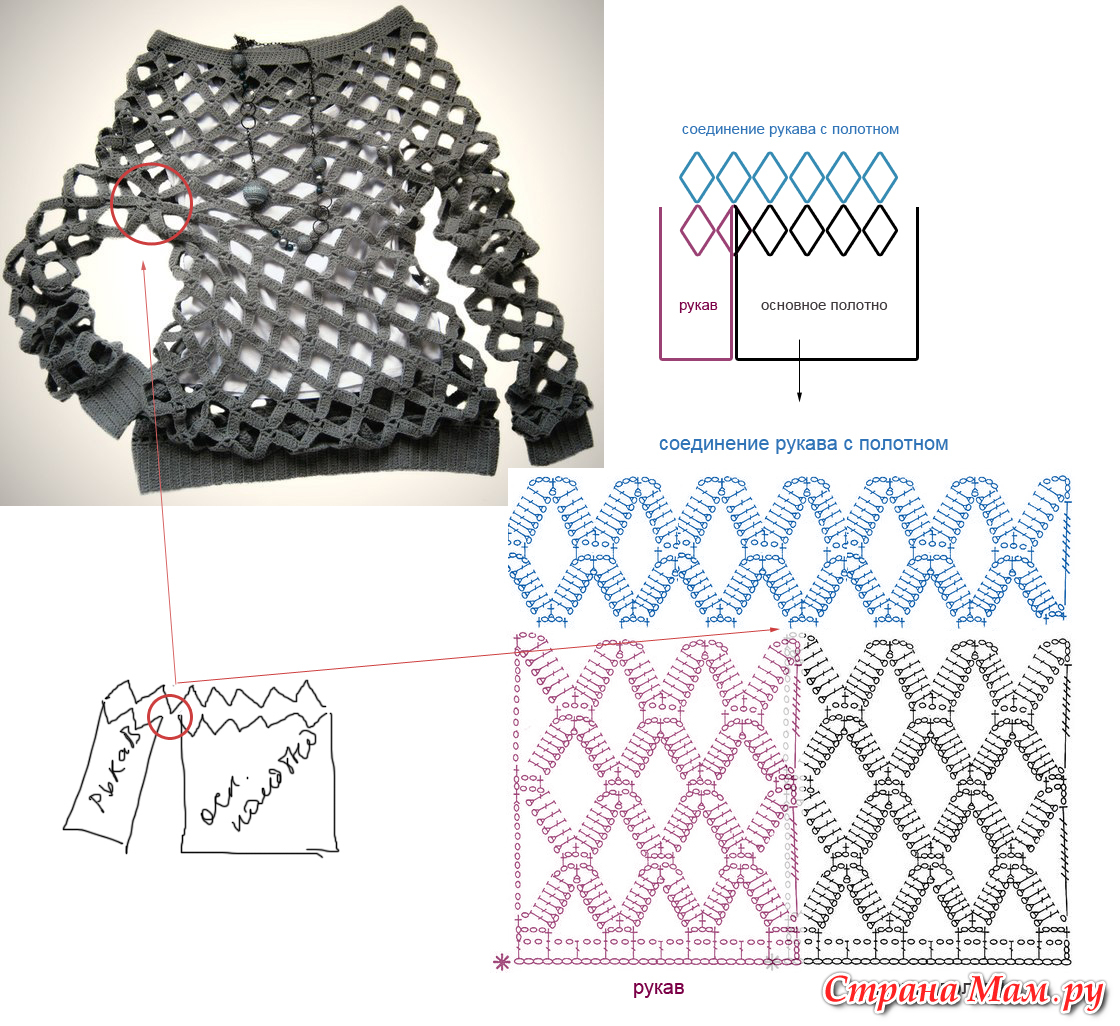 схема к ней и описание: связала резинку 2лицев, 2 изнаночные; после того как закончила вязать резинку связала ряд столбика с накидом, дальше вязала по схеме по кругу, до линии груди; рукава вязала аналогично по кругу; затем соединила все три части и вязала по кругу; убавляла количество столбиков в каждом раппорте; закончила резинкой
