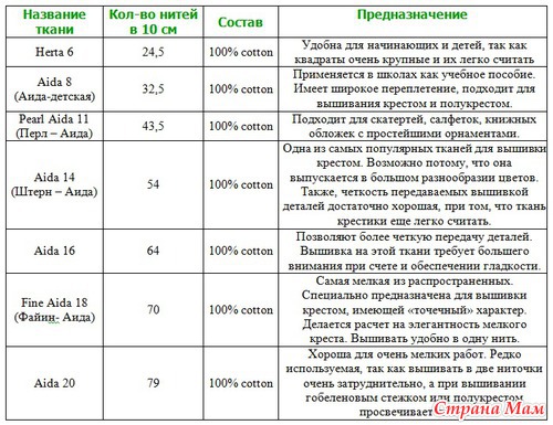 Этот вид канвы состоит из тканей, которые сотканы так называемыми блоками, из жёстко переплетённых нитей 4x4, образующих чёткие квадраты. Это делает их очень удобными для счетной вышивки. За некоторым исключением состоят из 100% хлопка. Как правило, это довольно жесткая ткань, что тоже является большим плюсом - даже без использования пяльцев крестики на плотной ткани получаются ровными и красивыми. Аида подходит также для других счётных видов вышивки. Аида бывает с разным числом переплетения нитей. Удобно то, что Aidа различается по размеру (его еще называют английским словом caunt- это количество "квадратиков" ). Очень широкая цветовая гамма и разные размеры ( (6", 8", 11", 14", 16", 18", 20", 22" )