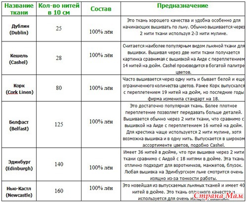Льняные ткани состоят из одиночных нитей с чередующимся переплетением, когда нить идет сверху, а потом снизу перпендикулярной ей нити, что похоже на плетение корзинок. Продольная и поперечная нити отличаются друг от друга и называются нить основы и нить утка, соответственно. Для вышивки ткань лучше расположить так, чтобы фабричный край ткани был расположен с какой либо стороны, а не сверху или снизу. То есть ось верх-низ вышивки должна располагаться вдоль нити основы. Если ткань уже отрезана и на ней нет фабричного края, то нити можно различить так: нужно выдернуть по одной горизонтальной и вертикальной крайней нити и та из них, что более искривлена, будет нитью основы (то есть параллельна фабричному краю). 100% льняные ткани выпускают с переплетением 18, 25, 28, 32, 36 и 40 нитей на дюйм (2.5 см). Каждая из этих тканей, с определенным переплетением, имеет своё название.