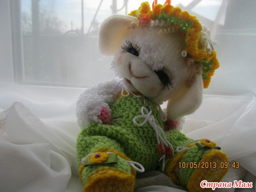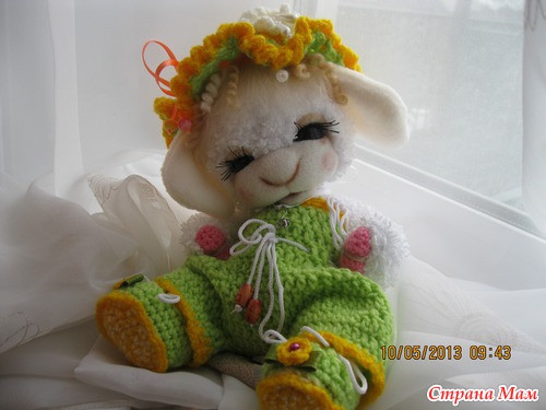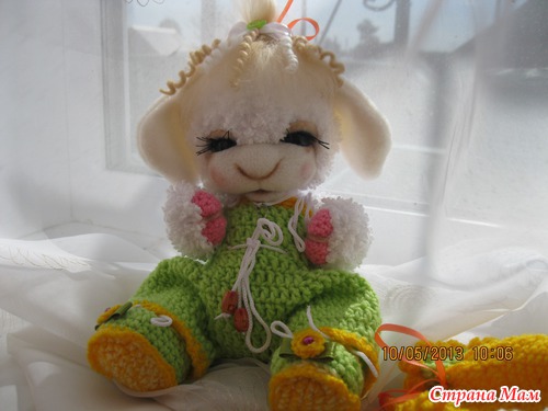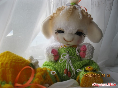 Масечка маленькая овечка. Ростиком 23 см. Малышка связана из детской фактурной пряжи. Мордочка сухое валяние. Головка поворачивается и наклоняется. Глазки открываются и закрываются. Ротик открывается и закрывается. Комбинизончик. шапочка и пинеточки связаны из детской пряжи. Одежда снимается. Сидит сама. Волосики мокрое валяние
