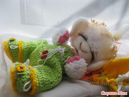 Масечка маленькая овечка. Ростиком 23 см. Малышка связана из детской фактурной пряжи. Мордочка сухое валяние. Головка поворачивается и наклоняется. Глазки открываются и закрываются. Ротик открывается и закрывается. Комбинизончик. шапочка и пинеточки связаны из детской пряжи. Одежда снимается. Сидит сама. Волосики мокрое валяние