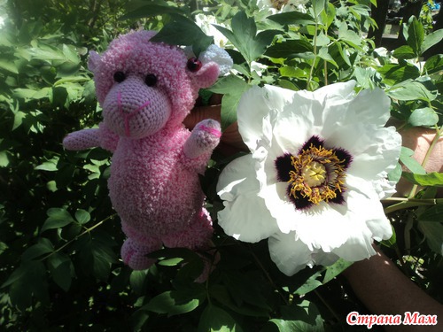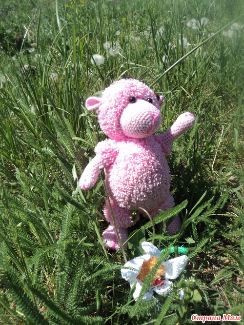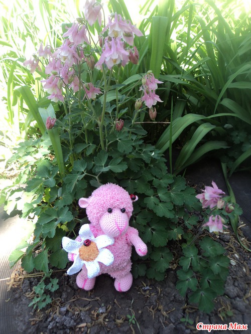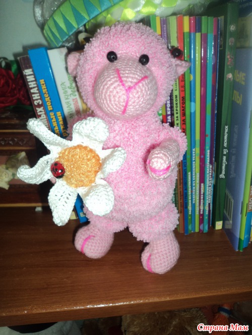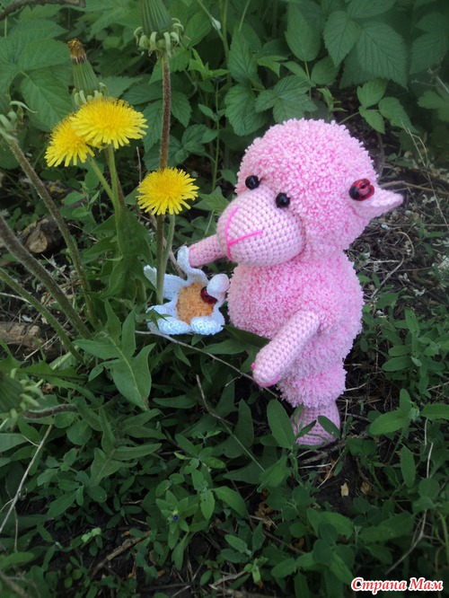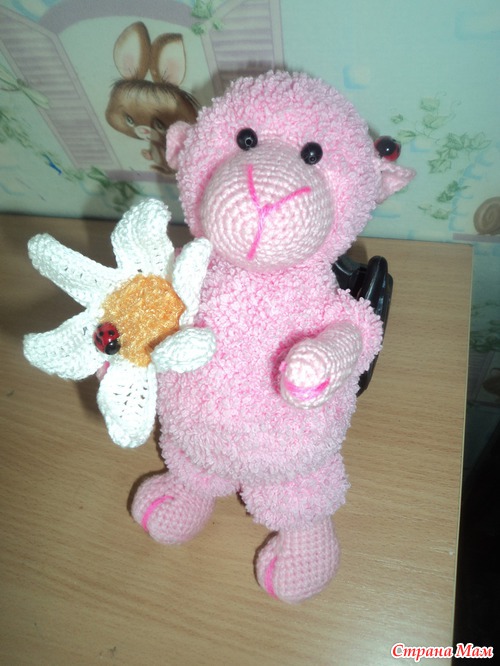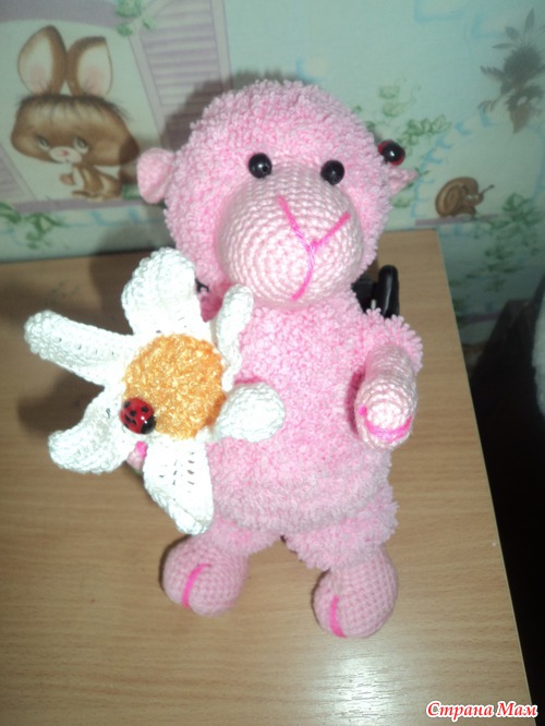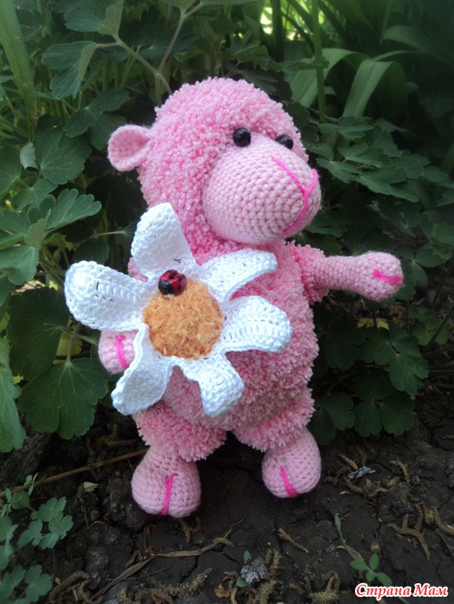 ( сколько их пошло не знаю - этими ниточками была шапочка вязана, я её распустила), вязала крючком №2, махру было немного тяжело поначалу вязать, но я приловчилась. Набита овечка синтепоном из подушки. Ромашка связана из разных остаточков (бегония, "Рам Юмос"(серединка), "Картопу Флора"(стебелёк и чашелистик), божьи коровки из полимерной глины(спасибо за них МамочкАнне)