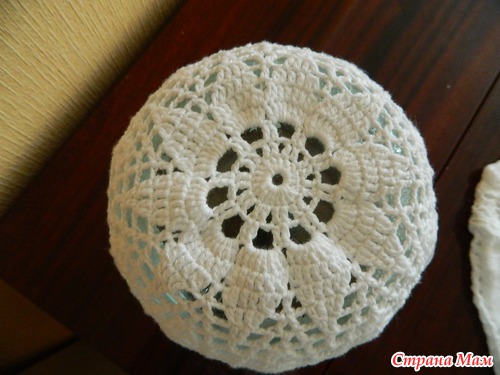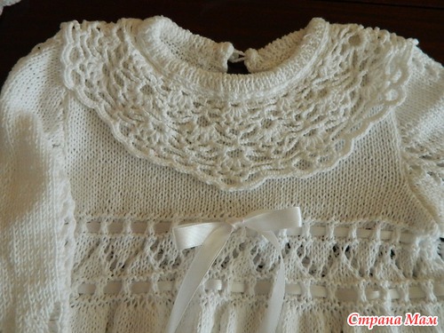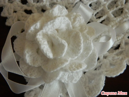 А вот мое творение. Использовала нитки soft coton.Vita coton, белые 6 мотков, спицы 2,5 мм. лента сатиновая шириной 1,2 мм, 3 м