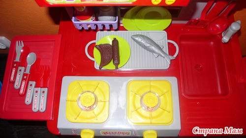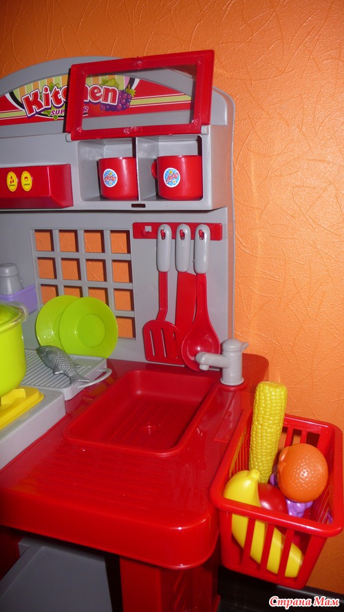 Наличие раковины также очень интересно моему поварёнку, он, как положено, "моет" руки, посуду и продукты и только потом приступает к процессу