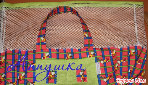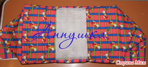 далее делаем ручки из ткани, сложенной вдвое, либо из широкой репсовой ленты. закрепляем ручки на нужных местах. далее делаем верхнюю часть сумки тоже из сетки для стирки белья. она будет служить защитой от выпадения пасочек при ходьбе (делаю из сетки, чтоб не утежелять конструкцию, т. к. делается для ребенка). тоже закрепляем булавочками по периметру сумки. к слову, все делала без выкройки и наметки - отрезал, приложил, пристрочил