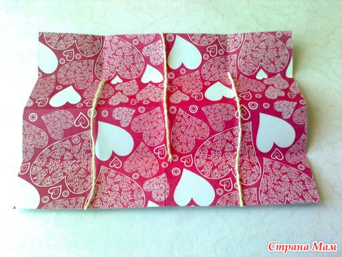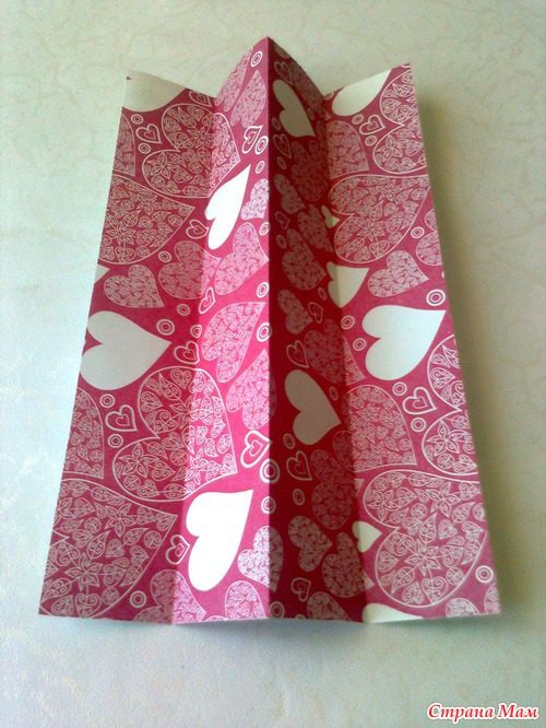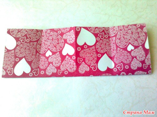 Ну а теперь расскажу, как я его делала. Лист бумаги формата А-4 сложить таким образом. Вначале пополам, потом каждую половинку тоже пополам. Швы хорошо "прогладить" обратной стороной ножниц или ножа.