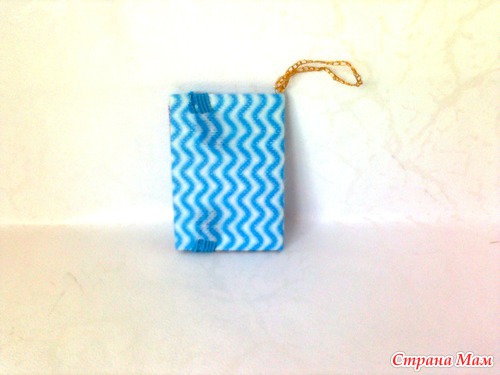 Вид сзади. Резинка служит застёжкой. Подсмотрела такой способ застёгивания блокнотов в магазине "Всё по 37". Резинка приклеена к картону клеем Dragon и в прорези выведена наружу.