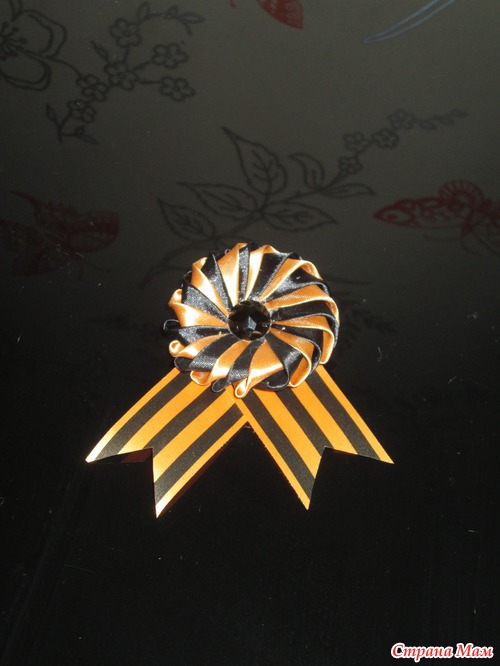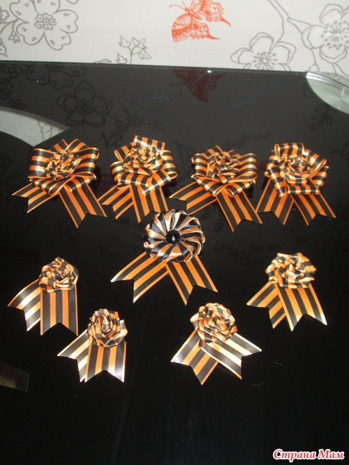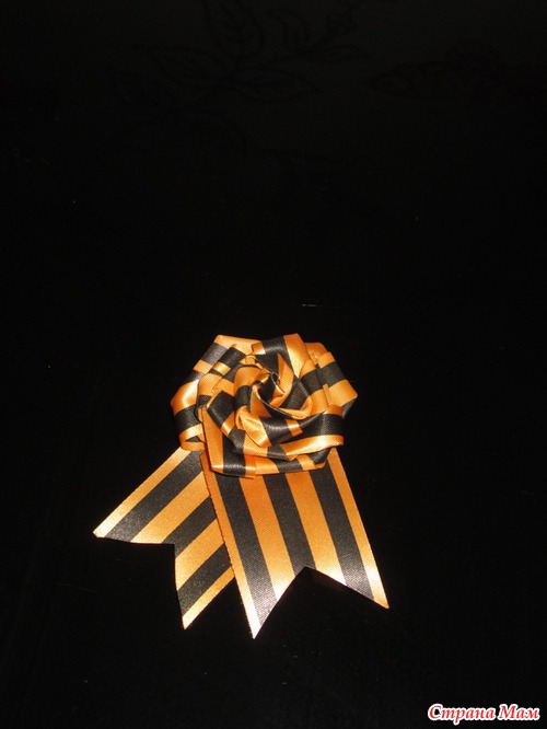 Только сегодня крутила в руках ленту, похоже репсовую тоже в георгиевских тонах! Клуша я , почему умная мысля пришла не 8-го вечером! Дитя моё с мужем ходили на парад с обыкновенными лентами