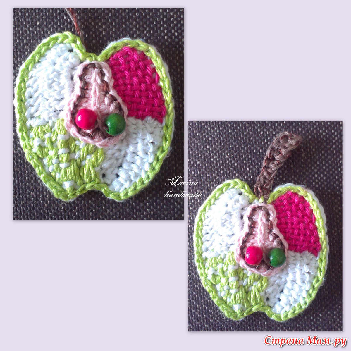 А теперь разберём яблоко. Схемку для него я брала вот такую (хотя можно и самому связать круг с выемками по противоположным сторонам, но это в следующий раз). Рядом схема груши, так что можно и её потом разукрасить...