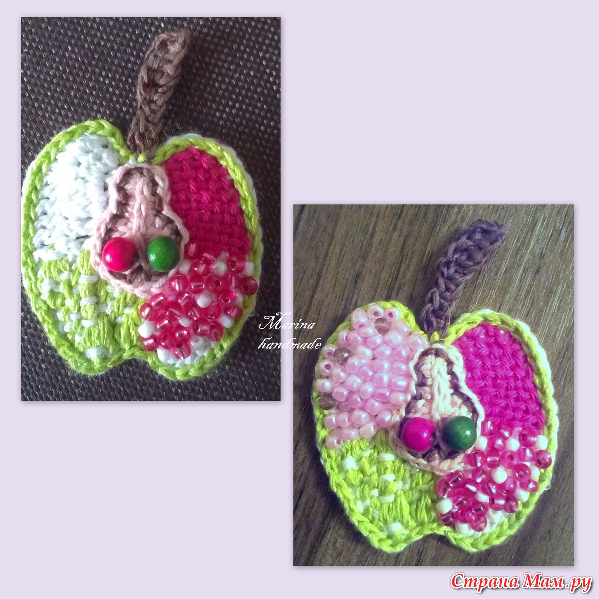 Вяжем по схеме основу для нашего яблоко белым цветом, т. к белый цвет лучше всего передаст все цвета бисера, которые мы выберем. Затем нежно-розовую сердцевину. Схему рисовала от руки. но думаю, что всё понятно и видно, и подбираем к сердцевине две пуговицы в тон к шапочке. Я выбрала деревянные бусины - малиновую и зелёную.