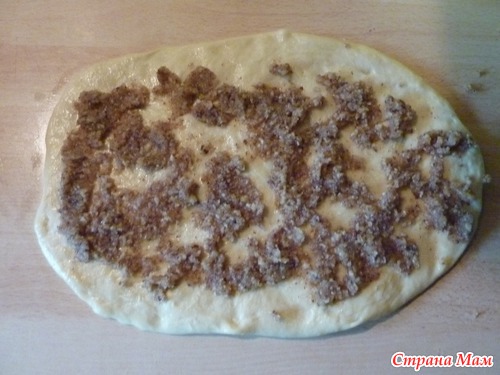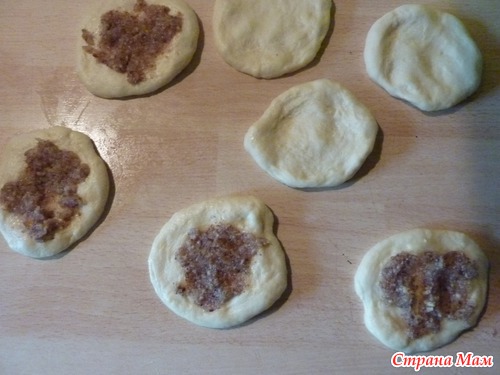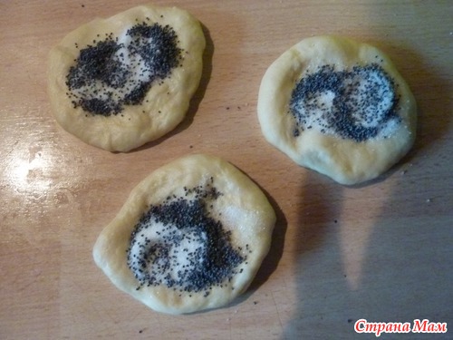 Лепешку смазать сливочным или раст. маслом и посыпать сахаром и маком (на одну плюшку ~1- чайную ложку сахара), или ореховой начинкой