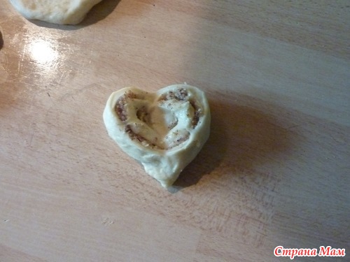При помощи ножа сделать глубокий надрез на изгибе рулетика, не разрезая до конца ~2 см и развернуть две получившиеся половинки рулетика сахарной стороной вверх (получается плюшка в виде сердечка).
