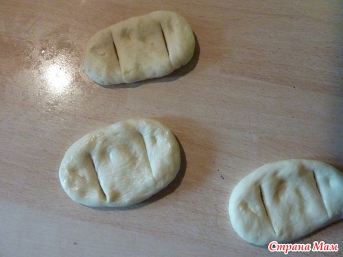 шарик раскатать пальцами в овальную лепешку и сделать надрезы с двух сторон как на фото