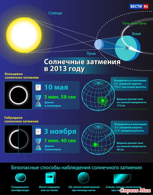 Луна закрыла Солнце на 95%. Это было первое из двух затмений 2013 года. Второе произойдет в ноябре, и его можно будет увидеть в экваториальной части Африки и в северной Атлантике, возможно, его удастся наблюдать даже на российском Черноморском побережье.