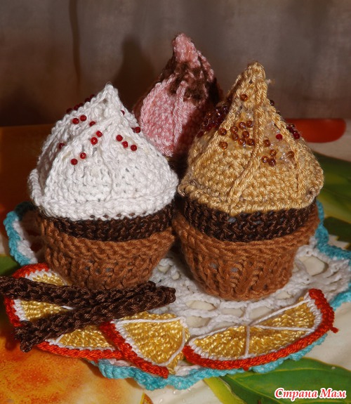 После основного блюда Омара с зеленью https://www.stranamam.ru/post/5510471/ я решила, что нужен еще десерт (связала я это все для конкурса и еще не решила- себе оставить или в сад отдать). Вот "состряпала" такие пироженки из различного хлопка. Нашла у себя в корзинке уже готовую салфеточку-снежинку и сделала из нее блюдо, прежде накрахмалив. Для декора апельсинки и корицу, хотя сын говорит, что это мороженое и шоколад))). В общем, прошу всех на чай!!!