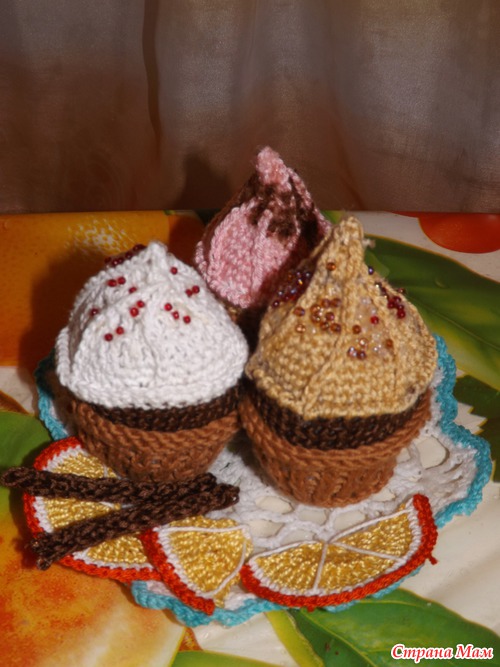 После основного блюда Омара с зеленью https://www.stranamam.ru/post/5510471/ я решила, что нужен еще десерт (связала я это все для конкурса и еще не решила- себе оставить или в сад отдать). Вот "состряпала" такие пироженки из различного хлопка. Нашла у себя в корзинке уже готовую салфеточку-снежинку и сделала из нее блюдо, прежде накрахмалив. Для декора апельсинки и корицу, хотя сын говорит, что это мороженое и шоколад))). В общем, прошу всех на чай!!!