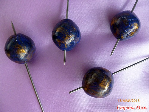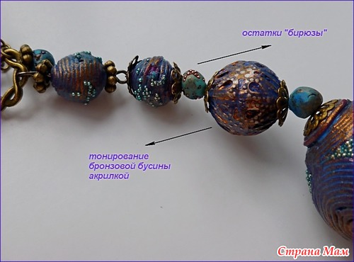 Затем с помощью экструдера сделала тонкие жгутики из пп фиалкового цвета и выложила кругами, как бы "филигрань". Остались незаполненые места, которые еще и наковыряла для глубины. Далее по уроку sister_le, измазюкавшись как свин, наносила синюю и бирюзовую акрилку и, конечно накидала бронзы. Углубления залиты гелем с добавленим микробисера.