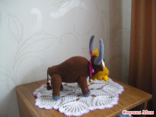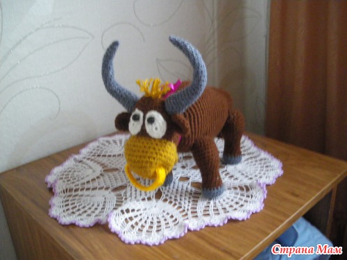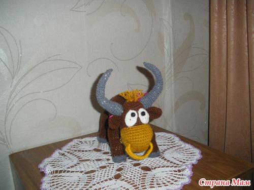 В нашей семье грядет юбилей, юбиляр родился под знаком зодиака- Телец, вот ему и связался этот подарочек (в дополнение к основному), автор этого создания Марина Борисова, спасибо ей большое, вязала из акрила, крючок№ 3 (кловер)