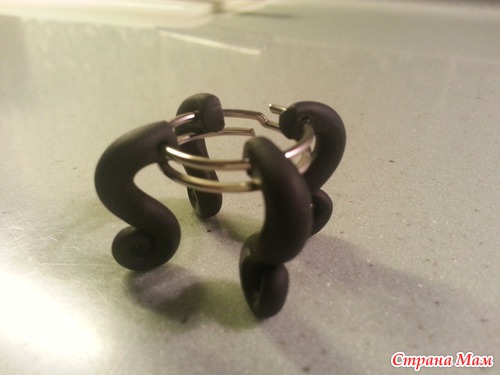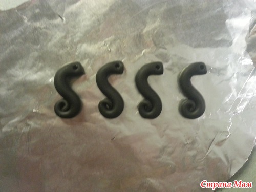 итак, вариант1. из полимерной глины. скручиваем 4 таких загогулины, делаем в них дырочки. и запекаем в духовке, согласно инструкции к глине.