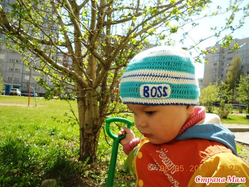 по шапочке на каждого. Начну с сына - ниточки Пехорка детская новинка белого и тёмно-синего цвета, Пехорка кашемировая бирюзового. Долго не могла придумать аппликацию - решила сделать надпись "Босс"