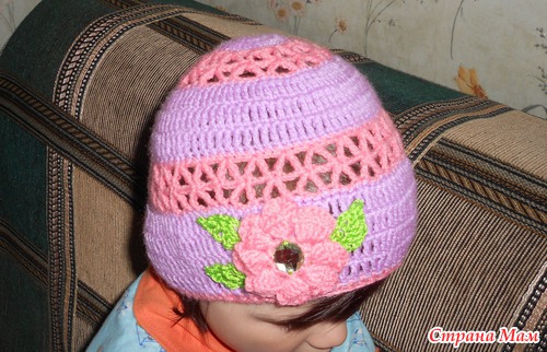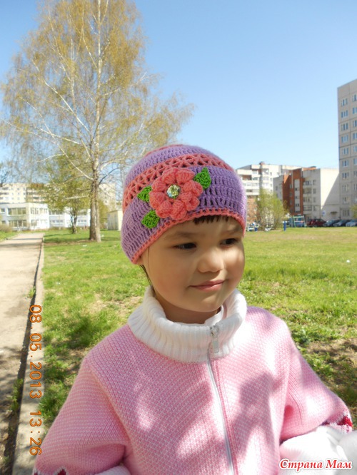 Шапочка для дочки связана нитками Пехорка детская новинка сиреневого и кораллового цветов крючком номер 2. Цветочек, к сожалению, как вязала не могу объяснить... В схемах не разбираюсь... вязала по видео урокам. Листочки для цветочка связаны из Ириса крючком номер 1. Сиреневыми ниточками вязала столбики с двумя накидами, а коралловыми - диагональную сеточку.