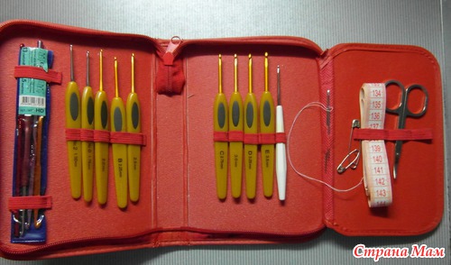 Все хвалятся своими органайзерами, они мне очень нравятся, такие ткани подобраны красивые, прелесть. А я леньтяйка, приспособила для этого школьный пенал моей дочки. После окончания школы он перекладывался с места на место. Выкинуть жалко, а использовать некуда. Мысль пришла нежданно - не гаданно. А может в интернете прочла у кого, не помню. И вот мои кловеры обрели постоянное место жительства. Со старыми, советскими пока расставаться тоже не собираюсь, вот все в кучу и собрала. Так как я вязание беру с собой на работу, то в компанию к крючкам положила метр портняжный, ножницы, иголки и булавки. Полный комплект.