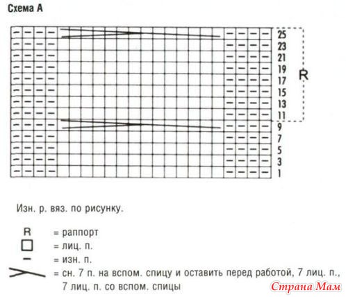 Для выреза горловины на высоте 72 см с правой сторон убавить в каждом 4-м р. 8 раз по 1 п. след. образом: в начале лиц. р. вязать 21 п. жгутом, последнюю п. схемы вязать изн. вместе с 1-й п. лиц. гладью.