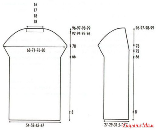 На высоте 78 см убавить с обеих сторон в каждом лиц. р. 14 (15; 16; 17) раз по 2 п. след. образом: с правой стороны (нач. р.) вязать 3 лиц. п., снять 1 п., 2 п. вместе лиц. и протянуть через снятую п.; с левой стороны вязать до последних 6 п., 3 п. вместе лиц., 3 лиц. п.