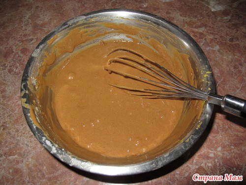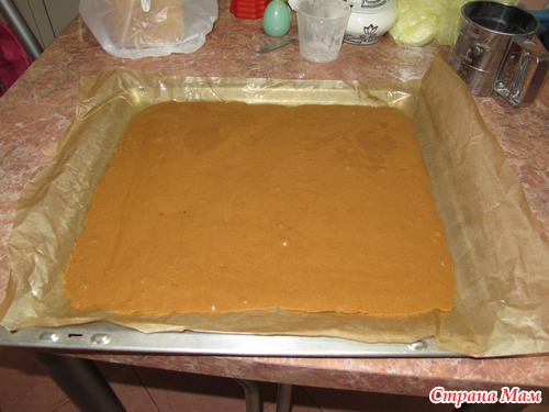 3. Духовку разогреть до 180°C. Противень выстлать пергаментной бумагой, промазанной сливочным маслом. Вылить на противень тесто, разровнять. Выпекать 20-30 мин.
