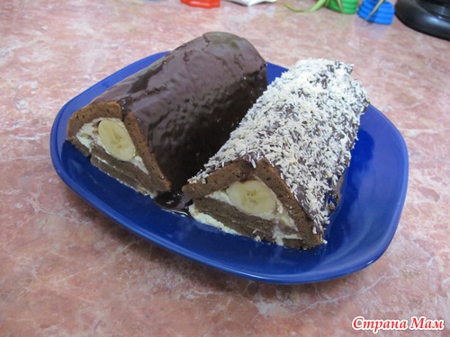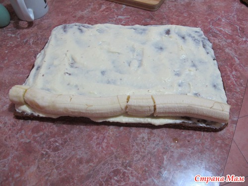 6. Влить бренди в кофе. Остывший рулет развернуть и пропитать кофе, дать постоять 5-10 мин. Бисквит намазать кремом. В начало каждого пласта положить по очищенному банану и свернуть рулетом.
