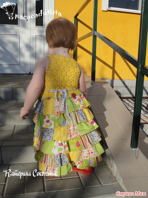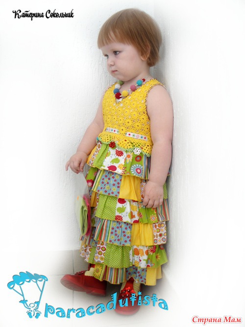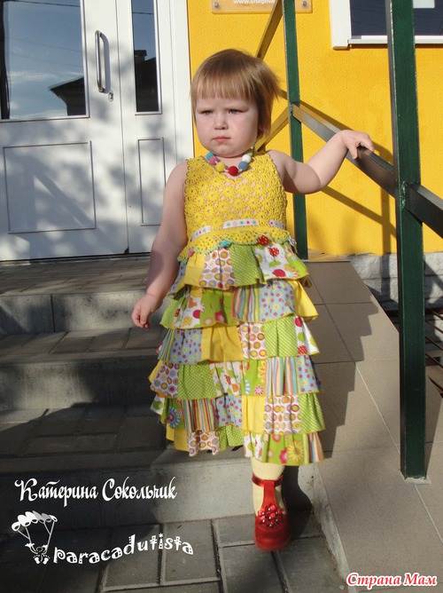 Яркое комбинированное платье для дочки на 2 года :вязание крючком + пэчворк.