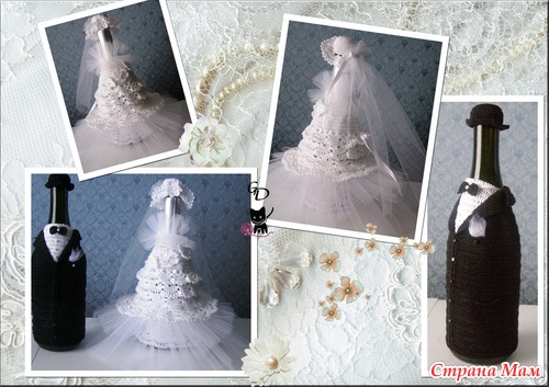 Свадебное шампанское для молодых. Хлопок, тюль, бусинки, атласные ленточки. Приодетое шампанское уедет летом в Белоруссию. update: сделала описание платья невесты. Читать полностью