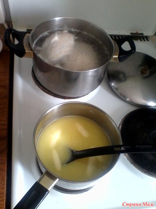 Так вот - на плите на переднем плане топится масло в молочной смеси на сдобу, а на заднем варится курочка для пирога (да-да, Ксюксище, колбасу я тоже не люблю