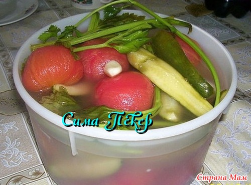 Нужны также зелень и кусочек корня сельдерея, несколько зубчиков чеснока и кусочек горького стрючкого перца. Кол-во перца и чеснока зависит от Вашего вкуса. В посуду сложить все подготовленные овощи и зелень. Залить чуть теплым рассолом. Оставить на сутки-1.5 суток при комнатной температуре. Помидоры готовы! Потом хранить в холодильнике.