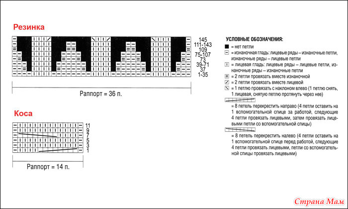 Коса: вязать согласно схеме. На ней даны лицевые ряды. Петли в изнаночных рядах провязывать по рисунку. 1-12-й р. постоянно повторять.