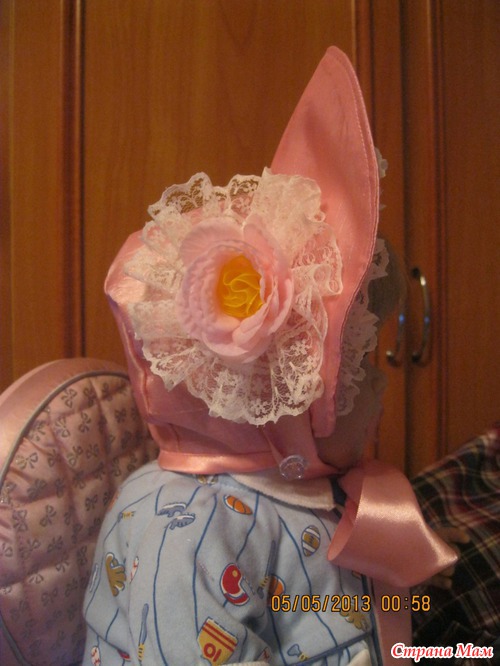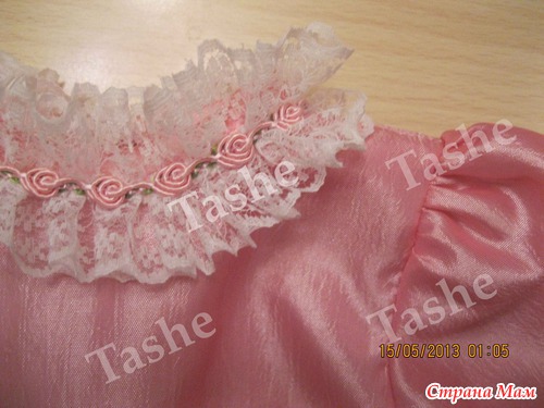 Платье сшито из тафты, украшено кружевом искусственным цветком из шелка и декоративной тесьмой.