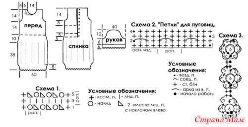 Обвязать вырез горловины и внутреннюю правую сторону спинки 2-мя р. ст. б/н, а левую - по сх. 2, выполняя "петли" для пуговиц.