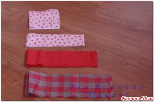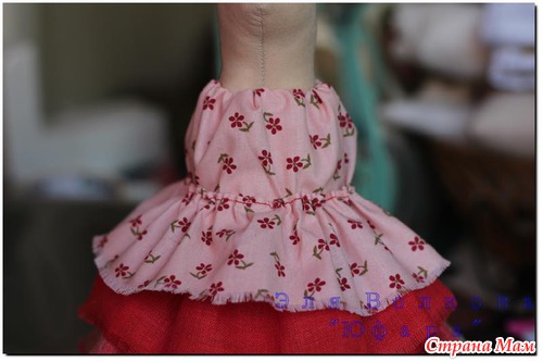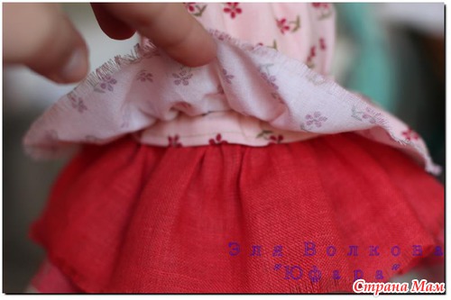 Отрезаем, края распушим, выняв несколько ниток, сшиваем, разглаживаем швы, собираем на нитку как гармошку и начинаем пришивать по очереди начиная с самого большого отрезка по нарастающей. Обратите внимание - когда одеваю верхнюю часть платья - все швы наши под ним прячутся, а остальные мы спрячем под репсовой ленточкой (я ее приклеиваю)