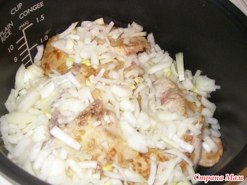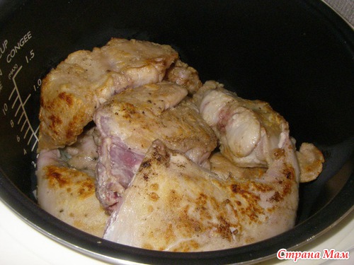 на дно посуды положить половину лука и выложить обжаренные кусочки